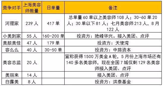 再来看看现在互联网 O2O 上门服务创业公司惯用的推广手段,无非就是以肩颈按摩的形式地推、接入团购、新用户首单低价体验这三招,如果您要认为这三招对美容目标消费人群管用的话,那我们来看看目前市场上的各家上门美容公司的情况吧。以上海市场为例: