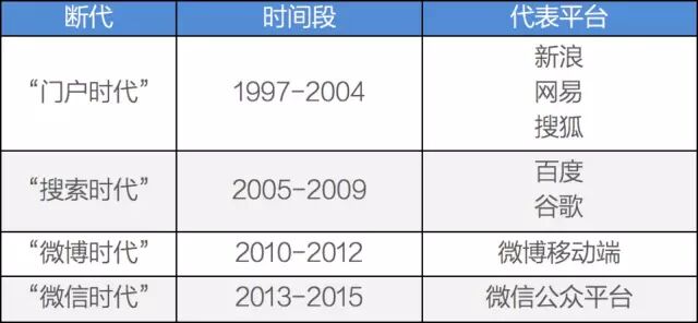 一场历史性的逆转出现了。到2015年下半年,中国互联网历史上曾经掌握过流量分配权的平台(三大门户、百度、QQ、微信、微博,加上今日头条的头条号),已经全部将权力下放至“自媒体”。