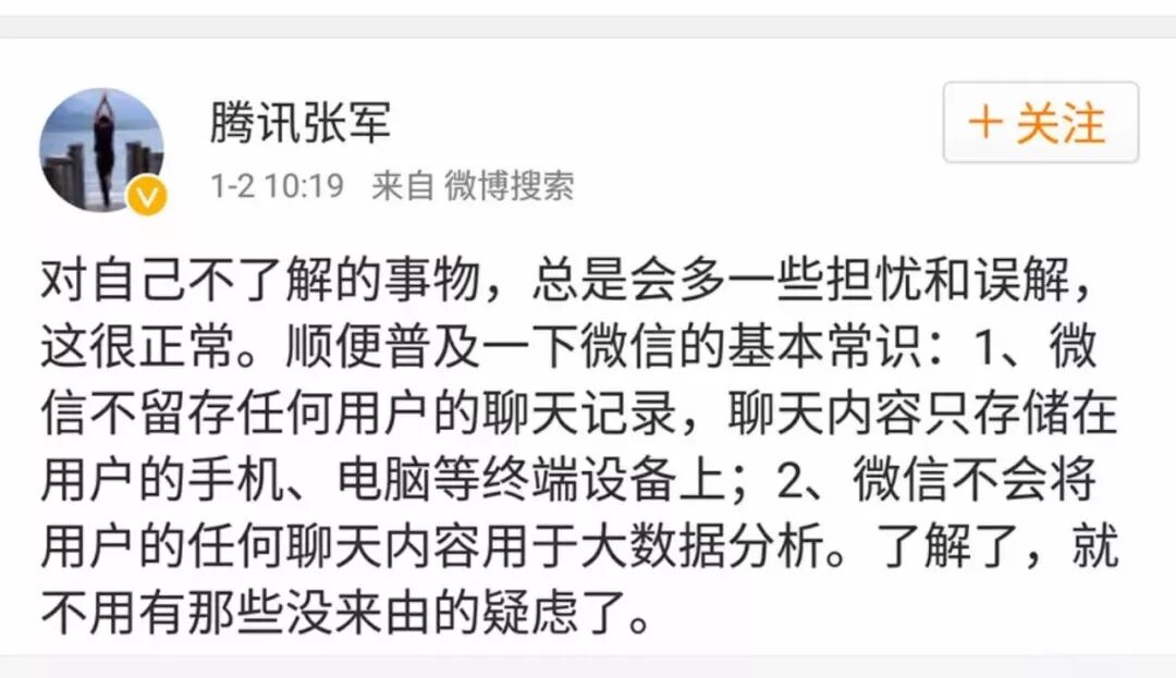 同时,腾讯公司公关总监张军也在个人微博表示,微信不会留存任何用户的聊天记录,不会将用户的聊天内容用作大数据分析。