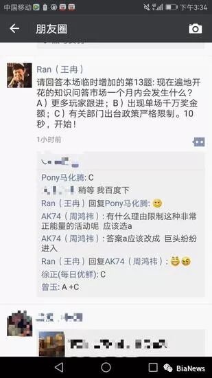 周鸿祎则不太认同马化腾的看法,他说“有什么理由限制这种非常正能量的活动呢?应该选择A”。相反,他对直播知识问答较为看好,并认为会有巨头进入知识问答领域。