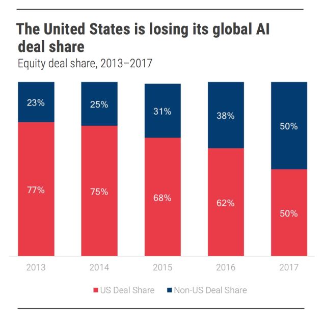 2017年,中国人工智能初创公司投入在全球占比48%,并首次超越美国占据榜首。2018年,据CBInsights预测,就人工智能创业公司和总股本交易数量而言,美国在全球仍将领先,但其正在逐渐失去全球交易主导地位。