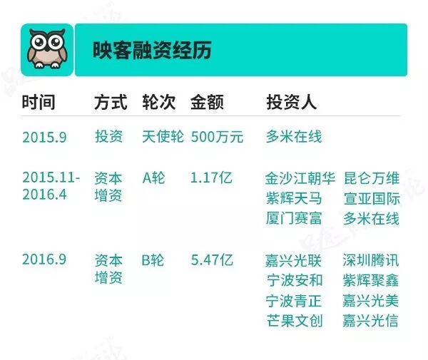 B轮融资中,映客又吸引到了嘉兴光联、嘉兴光美、宁波安合、宁波青正、芒果文创、深圳腾讯、紫辉聚鑫、嘉兴光信参与投资,此轮融到资金5.47亿。
