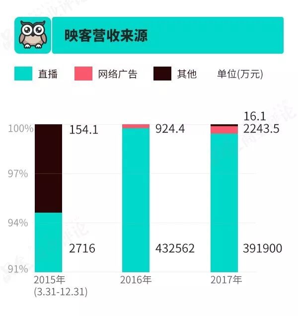 招股书中反映出一个令人担忧的问题——单一的盈利模式和畸形的收入结构难言具有持续性。2015-2017年三年来,映客几乎所有的收益都来自直播业务,直播业务所得收益占收益总额分别高达94.6%、99.8%及99.4%。