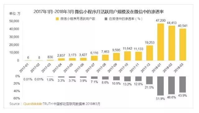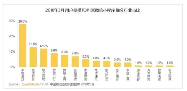 根据QuestMobile 4月24日发布的《微信小程序洞察报告》,截至今年3月份,微信小程序的月活跃用户规模已经突破了 4亿,2018年3月在微信中的渗透率也达到了43.9%,而在top100的小程序中,手机游戏的占比最高,达到了28%。