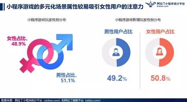 有意思的是,据阿拉丁小程序平台前不久发布的《小程序游戏TOP50榜单及研究报告》显示,微信小游戏的女性用户群体几乎占据了半壁江山,与男性用户平分秋色。