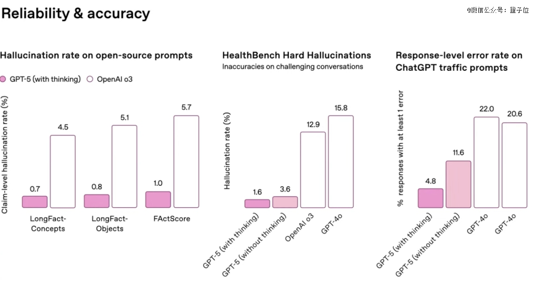 同时在可靠性和精准性上,GPT-5的提升也相当明显。