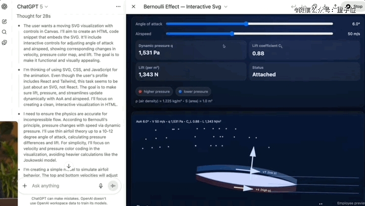 当进一步要求它生成一个动态SVG动画演示时,GPT-5进入深度思考模式。此时,用户可以点开查看其内部推理过程,清楚知道每一步是如何形成的。