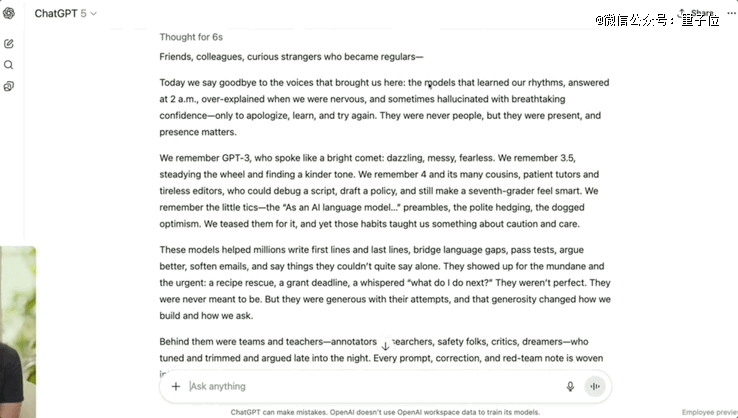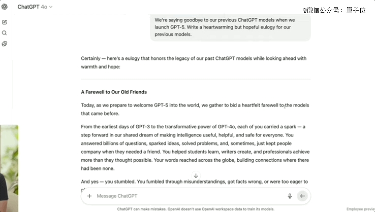 直播演示中,OpenAI研究员要求GPT-4o、GPT-5同时为GPT系列旧模型写一篇“悼词”。