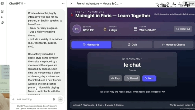 在展示中,研究员让GPT-5构建一个“学法语”的APP,允许自定义词汇、修改界面设计。