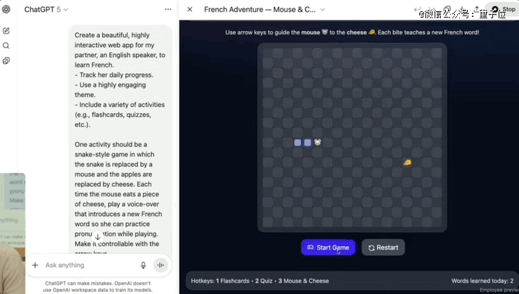要求在其中套一个贪吃蛇游戏,每吃掉一个物品就学一个单词,再要求把蛇替换成老鼠,苹果换成奶酪……GPT-5依然轻松应对: