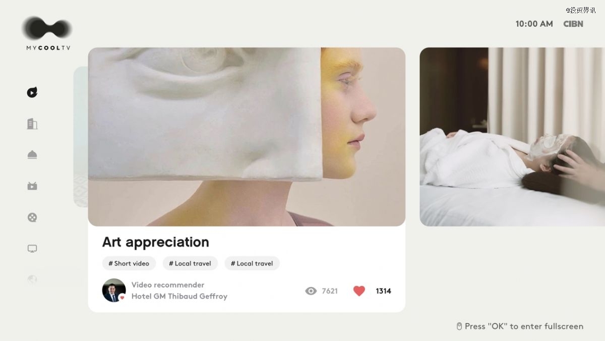 旅游新媒体平台是比利信息目前的基石业务。2016 年,比利信息创始人王洋将互联网电视技术应用到酒店客房娱乐场景,打造 MYCOOLTV 这一核心产品,2021年,比利信息正式将业务升级为“旅游新媒体平台”,即在提供技术支持之外,又增加了内容与版权服务,旨在为旅行者提供本地化历史、美食与建筑等内容,“类似一个大屏版的小红书或抖音”,王洋说。